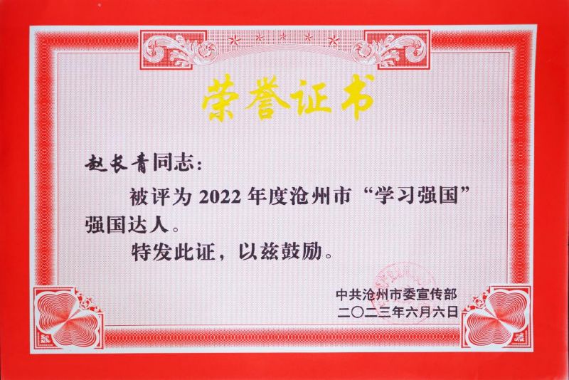 趙長(zhǎng)青被評(píng)為2022年度滄州市“學(xué)習(xí)強(qiáng)國(guó)”強(qiáng)國(guó)達(dá)人榮譽(yù)稱號(hào)