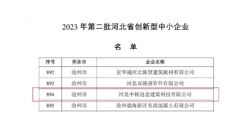 近日,河北中鐵滄鹽建筑科技有限公司獲評河北省2023年“創(chuàng)新型中小企業(yè)”榮譽(yù)稱號。